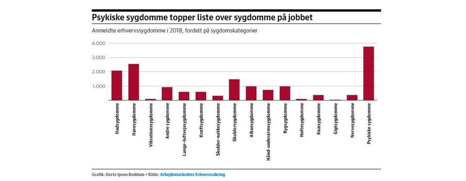 De her ting gør dig syg på jobbet. Glem ødelagte skuldre, smadret hørelse og eksemhænder. Når læger eller arbejdsgivere anmelder erhvervssygdomme, topper skader på sjælen listen over, hvad der gør danskerne syge på jobbet.