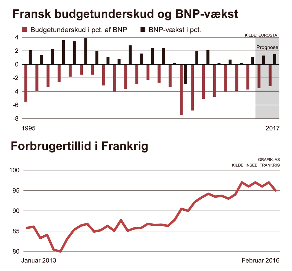 Frankrigs BNP-vækst blev 1,1 pct. sidste år, men man skal huske, at det er efter flere år med meget lav og delvist negativ vækst. I et optimistisk øjeblik sidste efterår vurderede Den Internationale Valutafond (IMF), at BNP-væksten ville fortsætte opad til 1,5 pct. i år. Det er nu skyndsomt korrigeret ned til 1,3 pct. for i år. Den eneste, som fastholder en forventning om 1,5 pct. BNP-vækst i år, er det franske finansministerium. Min egen holdning var sidste år, og forbliver, at det mest sandsynlige scenarie snarere bliver lavere vækst i 2016. Indtil videre ser jeg ingen grund til at ændre dette syn, med mindre den franske regering fremlægger nogle helt særlige økonomiske reformer senere i denne måned.