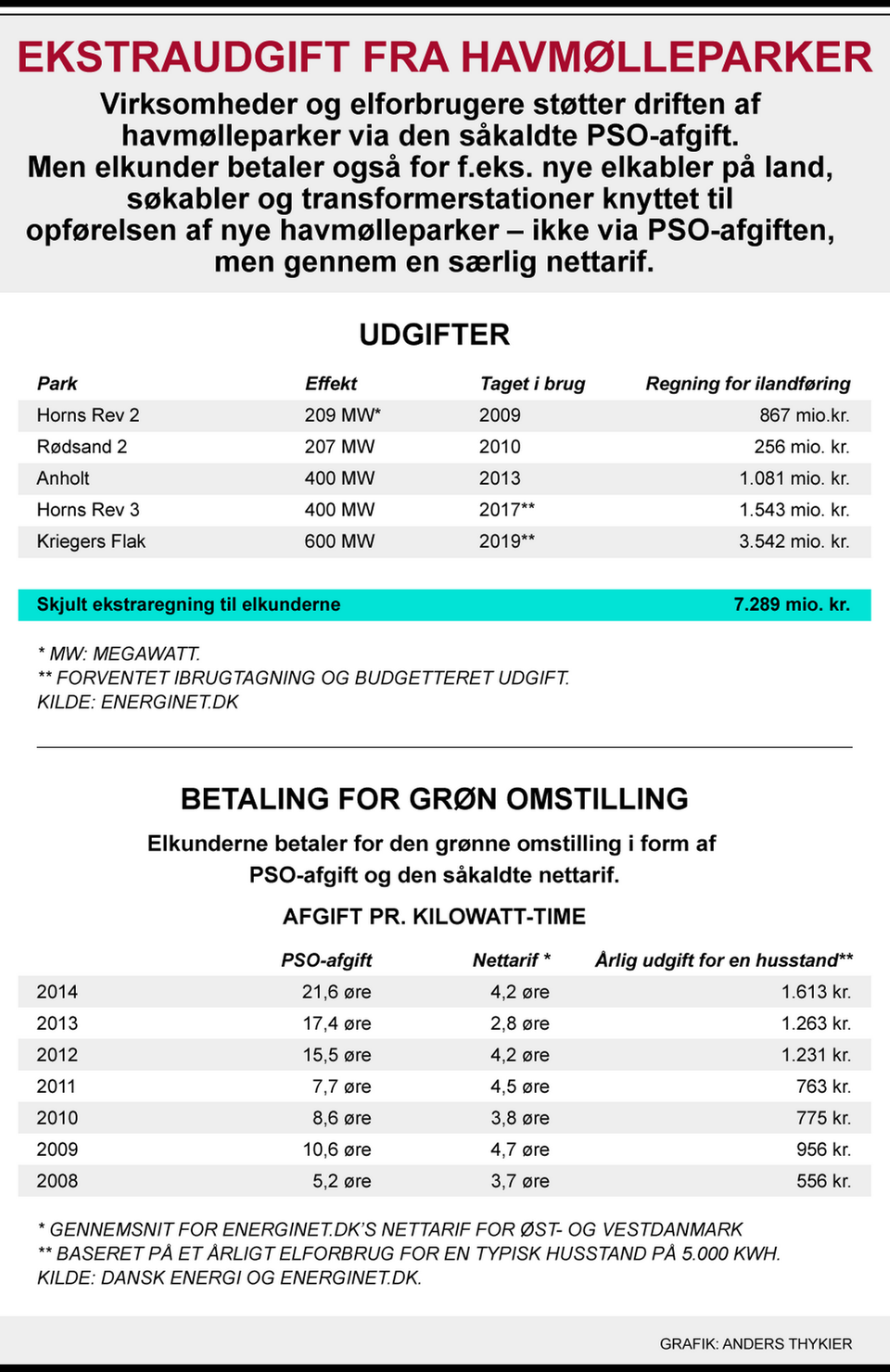 Elkunder betaler skjulte milliardbeløb til nye havmølleparker. Alene tilslutningen af havmølleparken Kriegers Flak vil koste 3,5 mia. kr. betalt uden om PSO-afgiften, og det slører de samlede udgifter ved det danske vindeventyr, lyder kritikken.