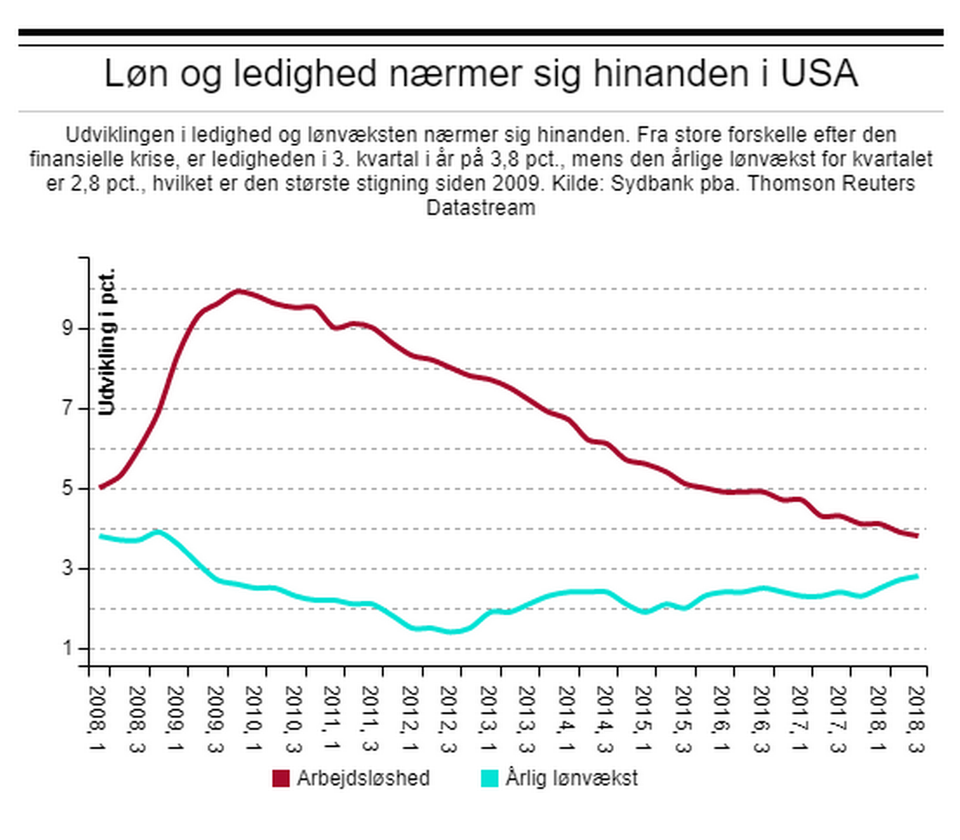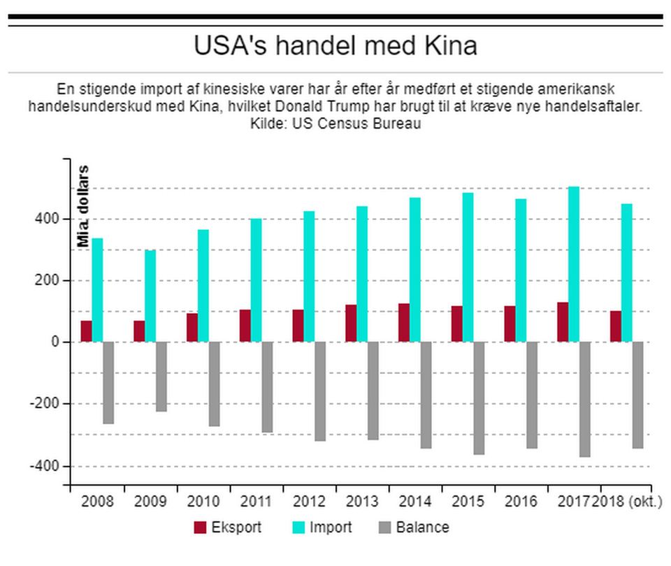 Men noget tyder på, at Trumps vigtigste parameter ikke går så godt. Nye tal torsdag viste, at handelsunderskuddet i oktober steg til 55,5 mia. dollars, hvilket er det højeste niveau i 10 år og femte måned i træk med et stigende underskud – og det er især handel med Kina, der skaber ubalancen, hvor underskuddet med stor sandsynlighed for første gang nogensinde runder 400 mia. dollars i år:
