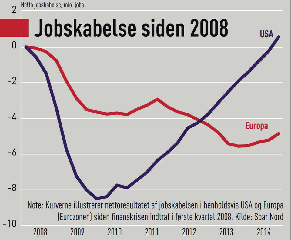 Hvor Europa stadig mangler at skabe knap fem millioner job siden krisen, er de tabte job i USA for længst genvundet.