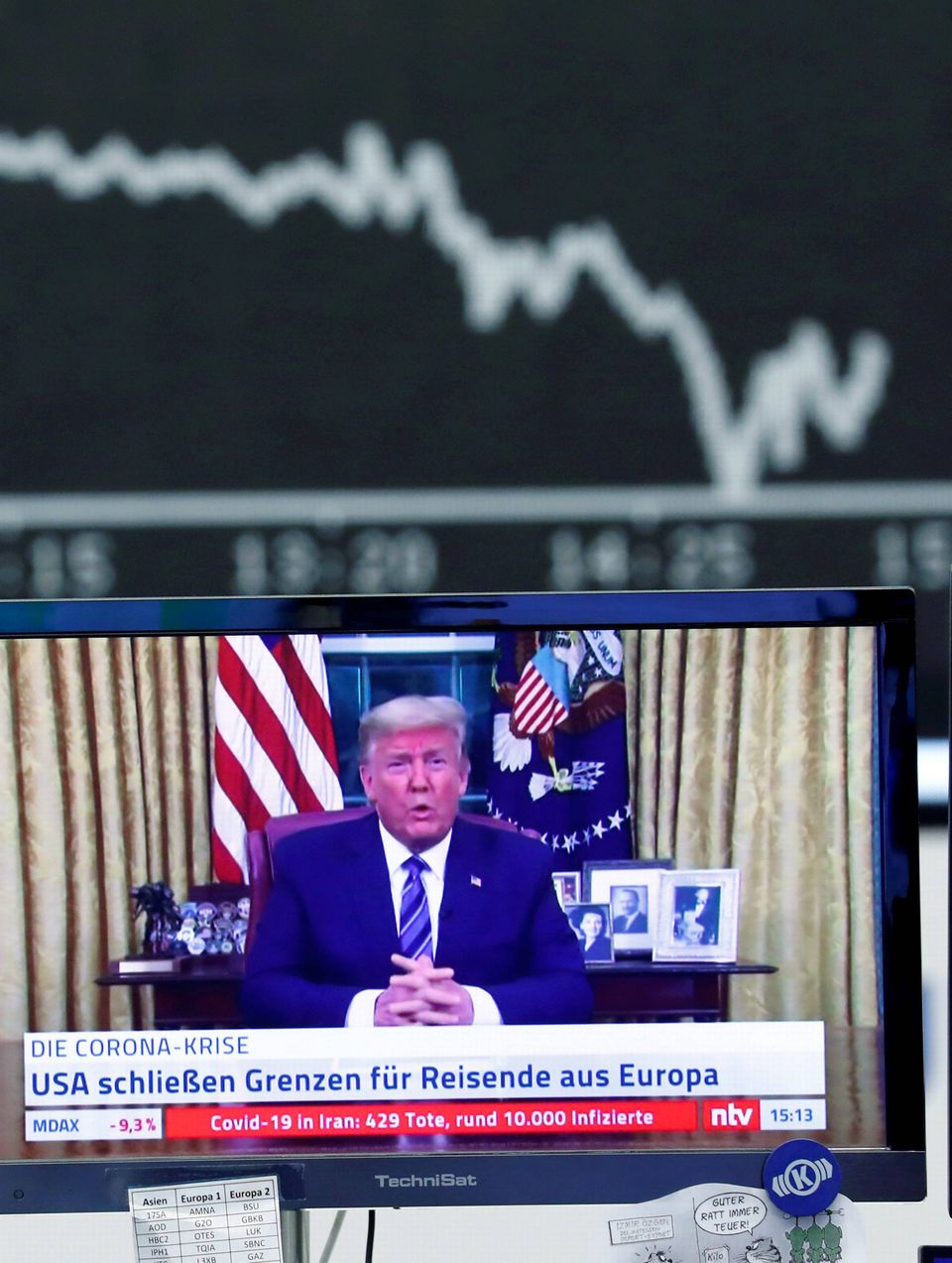 Donald Trumps noget snublende tale gav det umiddelbare indtryk, at forbuddet også ville omfatte et midlertidigt stop for samhandlen med Europa, hvilket man efterfølgende skyndsomt dementerede fra administrationens side.