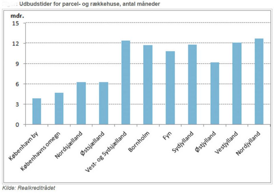 Der er en klar opdeling mellem øst og vest i udbudstiderne for huse. I hovedstadsområdet, Nordsjælland og Østsjælland har husene i gennemsnit stået til salg i ca. 4-6 måneder. I de fleste andre landsdele er udbudstiderne oppe på 11-12 måneder i gennemsnit.