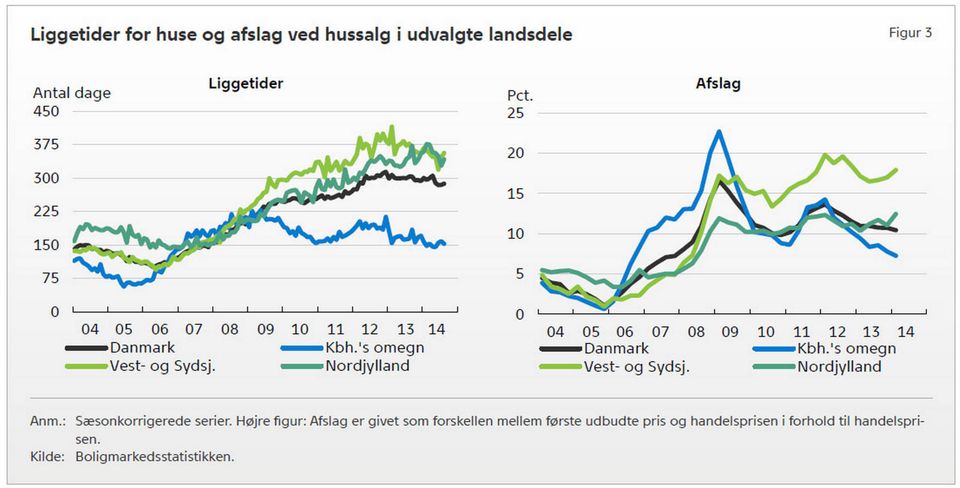 "Siden 2012 har liggetiderne på huse været omtrent 300 dage. Det er lang tid, og understreger, at hovedparten af boligmarkedet er underdrejet," skriver Nationalbanken.